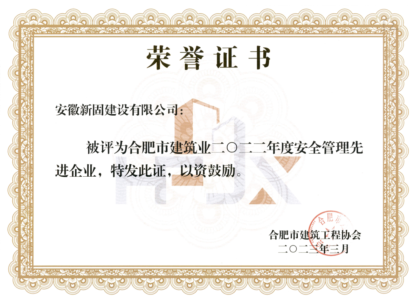 安徽新固被評(píng)為“合肥建筑業(yè)2022年度合肥建筑業(yè)安全管理先進(jìn)企業(yè)”