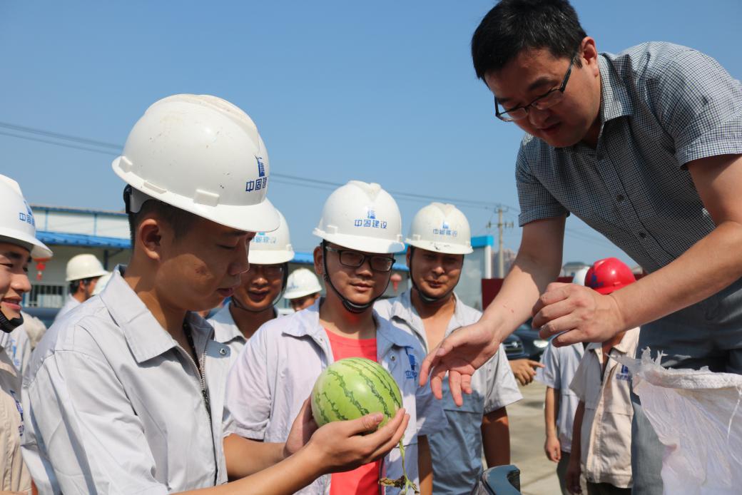 慰問過后,縣住建局領導頂著烈日爬上貨車為工友們搬西瓜、搬礦泉水,整箱整箱的水帶給他們的是炎炎夏日里最濃厚的情誼,溫潤了他們的心房。慰問組一邊遞給他們物品一邊叮囑我們:高溫天氣一定要注意防暑降溫,注意關愛工友。在隨后召開的座談會上,慰問組對高溫天氣施工提出了幾點要求和建議。要求項目部做好防暑降溫的各項準備工作,定期給崗位人員安排體檢,嚴禁患有高血壓心臟病的人群進入施工現(xiàn)場等。
