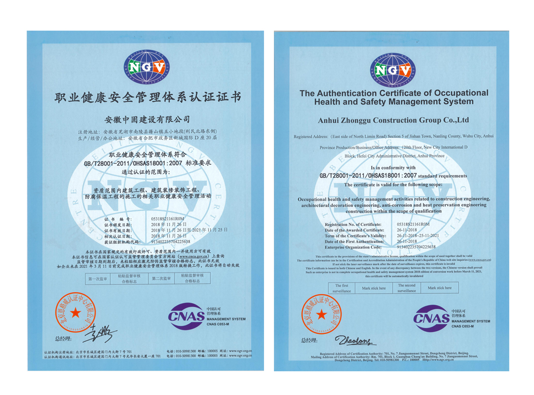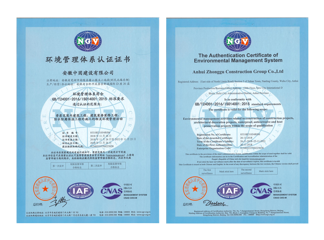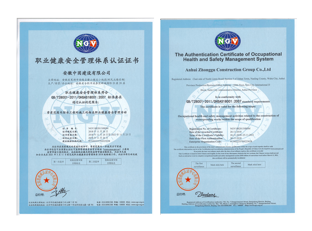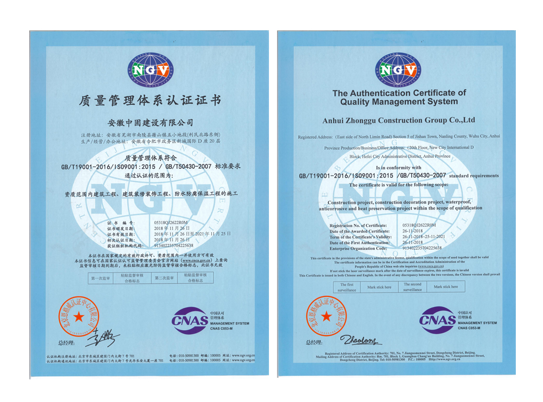 2018年11月15日至20日,北京恩格威認(rèn)證中心管理體系審核工作專家組,對(duì)我司資質(zhì)范圍內(nèi)的房屋建筑工程、裝修裝飾工程、防水防腐保溫工程施工等方面進(jìn)行了全面認(rèn)證。近日,經(jīng)評(píng)審,安徽中固建設(shè)有限公司順利通過了質(zhì)量管理體系認(rèn)證、環(huán)境管理體系認(rèn)證、職業(yè)健康安全管理體系認(rèn)證等證書。
